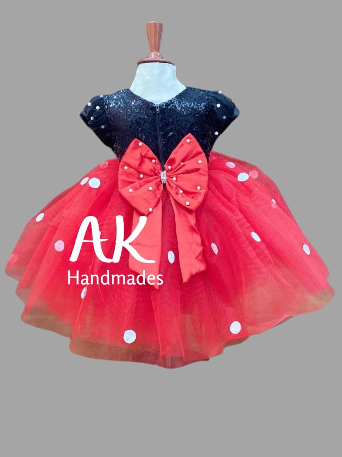 Minnie Birthday Dress Red for little girls its handmade polka dots design with puff sleeves with sequins body fluffy and also its comfortable fancy dress for girls. Silk big bow on back and silk belt on front looks amazing. Short frock design its perfect birthday or party dress for your girl. You can also order for you to match due Dress for Mama and Baby because its in fashion now a days.