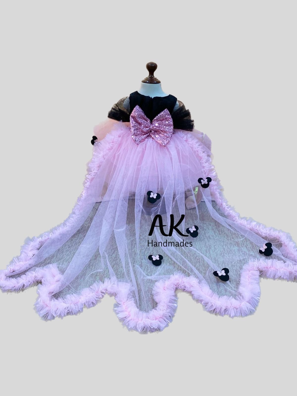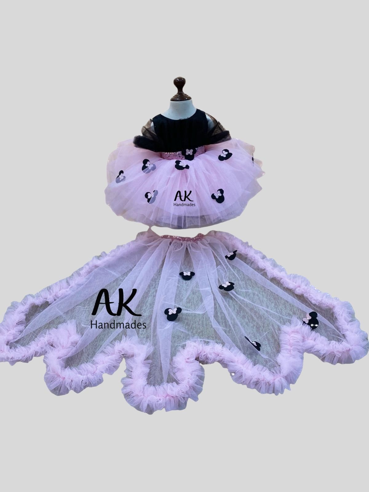 Minnie Detachable Tail Dress for birthday girl soft tulle net for dress with silk body sequins belt and bow with handmade fabric Minnie’s on dress. Its the perfect birthday dress for girls or you can use it as formal dress. The best option is detachable tail best part of this dress and color can be customized with the birthday theme like red or dark pink.