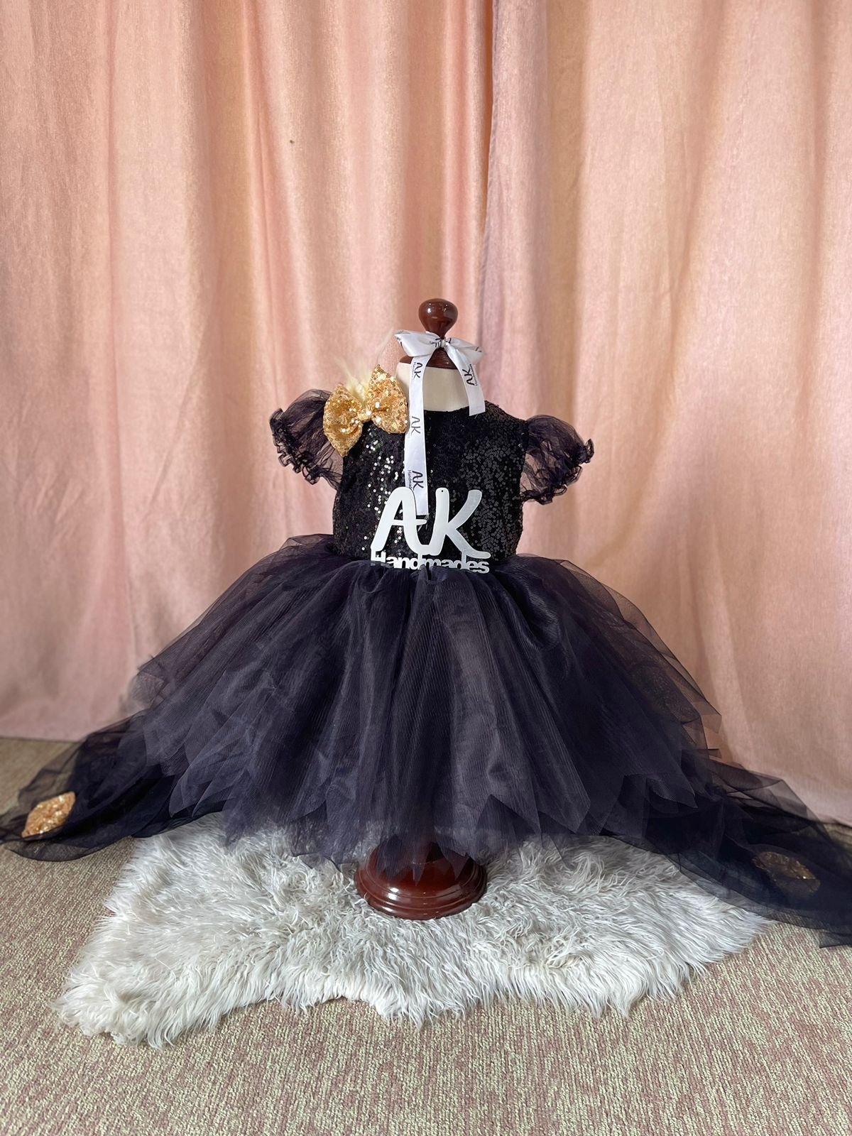 Tail Frock Black with long puff sleeves sequins bodice with tulle net bottom tail with sequins small flowers on tail.