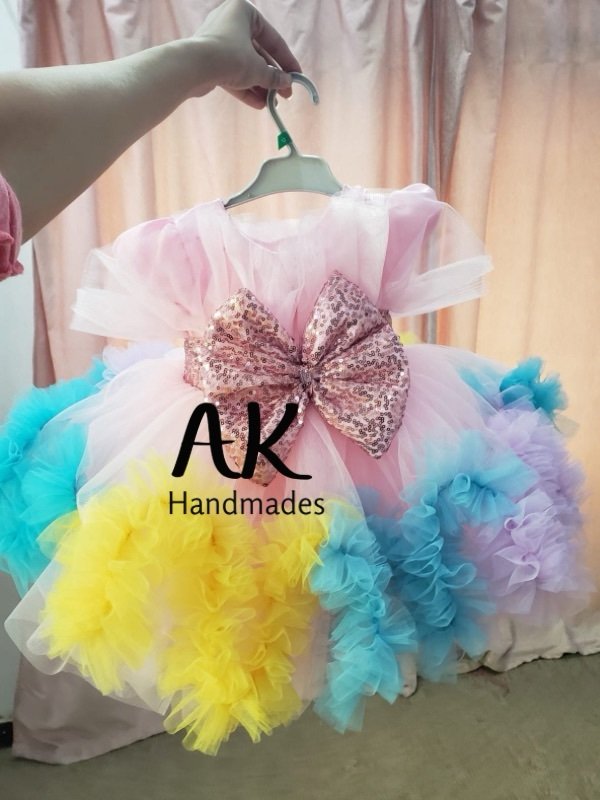 Beautiful unicorn multi color zigzag dress made with silk body and net flare with soft inner. Loaded with soft cancan imported net use to make this soft and comfortable.
